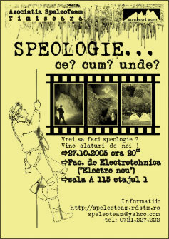 In perioada 26.10.2002 - 1.12.2002 Asociatia SpeleoTeam a organizat un curs de initiere in speologie. Scopul acestui curs a fost popularizarea speologiei. In cadrul actiunii au avut loc atit expuneri teoretice cit si iesiri in teren,7 sedinte si o iesire la pestera Meziad.